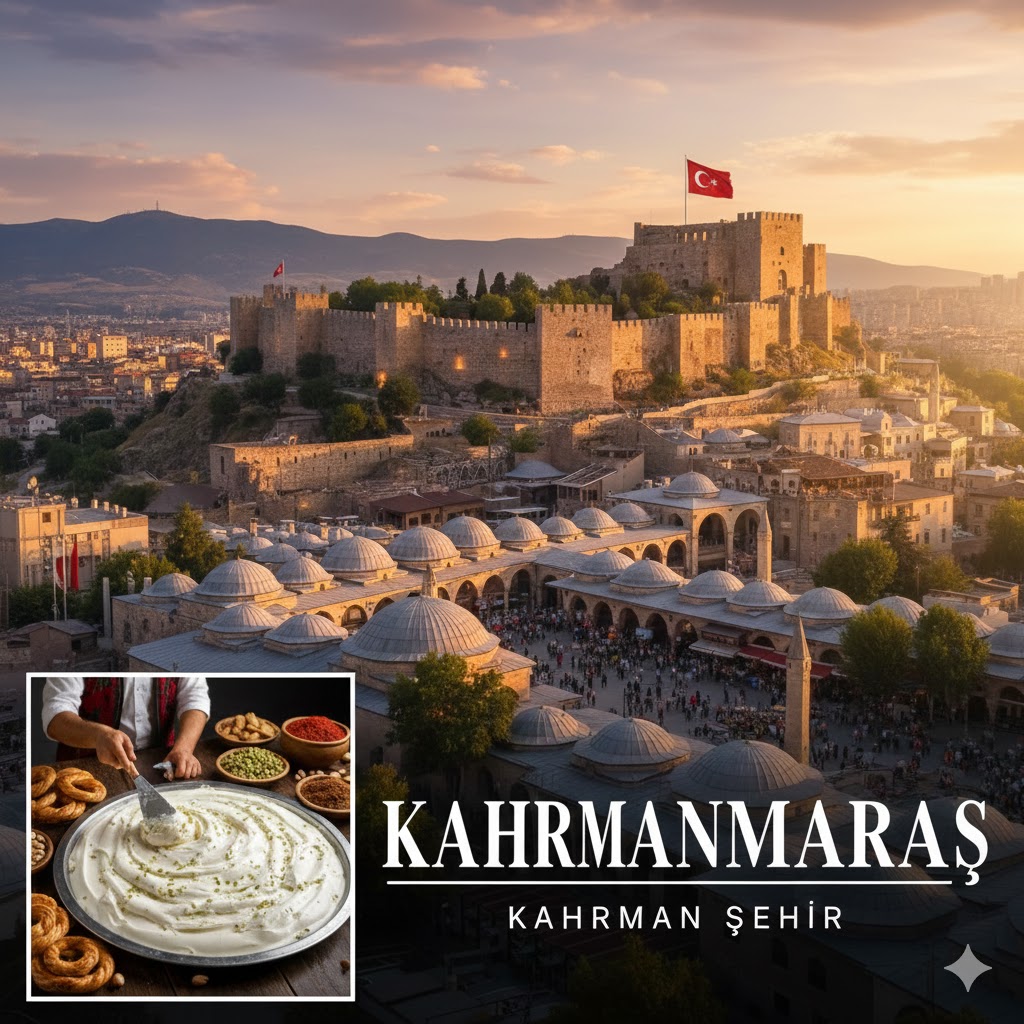 Kahramanmaraş, Türkiye'nin Akdeniz, İç Anadolu ve Güneydoğu Anadolu bölgelerinin kesişme noktasında yer alan, köklü tarihi ve dünyaca ünlü dondurmasıyla tanınan kadim bir şehridir. Antik çağlarda "Markasi" adıyla bilinen şehir, Milli Mücadele döneminde halkın gösterdiği büyük kahramanlık ve kendi kendini kurtaran ilk şehir olma özelliği nedeniyle 1973 yılında "Kahraman" unvanını almıştır. Şehrin kimliğini oluşturan en meşhur değer, şüphesiz Kahramanmaraş dondurmasıdır. Ahir Dağı'nın yamaçlarında beslenen keçilerin sütü ve bölgeye özgü dağ orkidelerinden elde edilen salebin birleşimiyle yapılan bu dövme dondurma, kendine has sert dokusu ve aromasıyla dünya çapında bir markadır. Gastronomi kültürü dondurmayla sınırlı kalmayıp; Maraş tarhanası, eli böğründe kebabı, Maraş çöreği ve kendine has pul biberiyle zengin bir mutfak mirası sunar. Tarihsel ve mimari açıdan Kahramanmaraş, Hititlerden Osmanlı'ya kadar pek çok medeniyetin izini taşır. Şehrin merkezinde yükselen Kahramanmaraş Kalesi, Milli Mücadele'nin fitilinin ateşlendiği yer olarak büyük bir manevi öneme sahiptir.