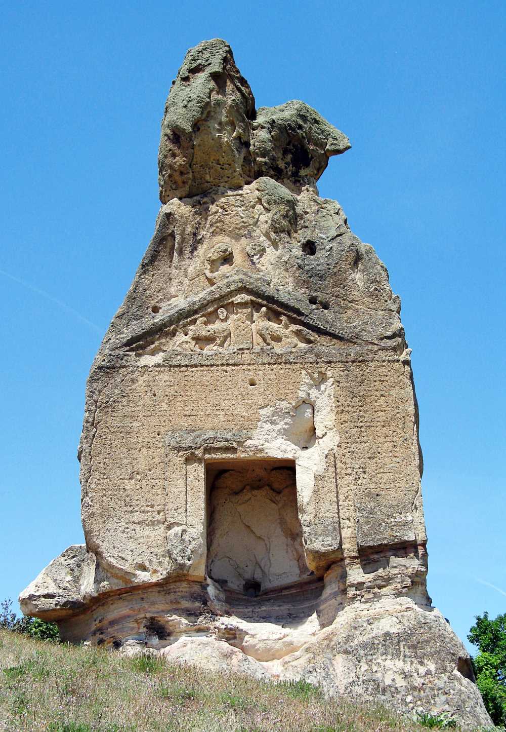 Frig Dönemi'ne ait kaya mezar odalarından biri olan Aslantaş Kaya Mezar Odası'nın ön yüzündeki kapı boşluğunun her iki yanında ayağa kalkmış, karşılıklı iki heybetli aslan ve ayakları altında birer yavru aslan ile kapı üstünde hayat ağacını andıran kütle ve bunun üstünde her iki yana uzanmış kanatlı güneş kursu, kabartma olarak yapılmıştır.