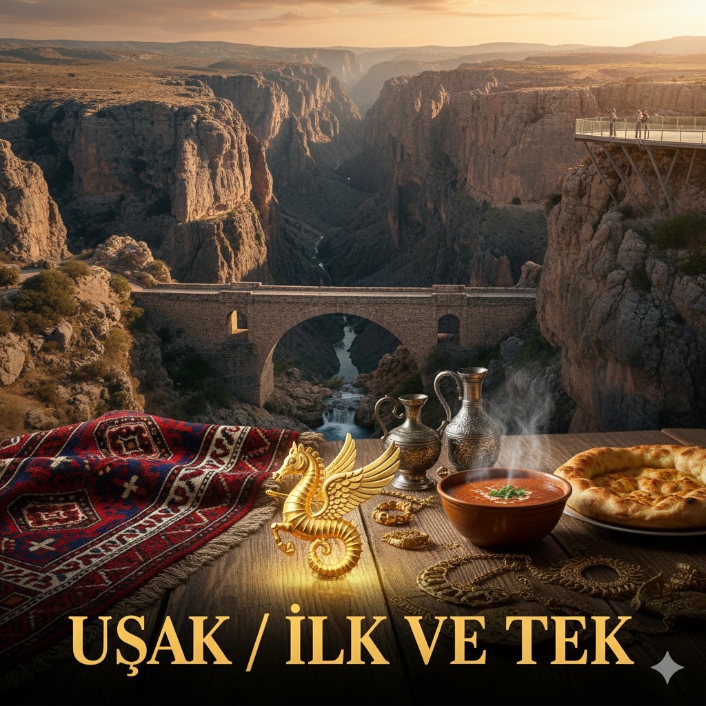 Uşak, Ege Bölgesi’nin İç Anadolu ile kucaklaştığı noktada yer alan, mütevazı görünümünün altında Türkiye’nin sanayi ve kültür tarihine yön vermiş devasa zenginlikler barındıran bir şehirdir. "İlkler Şehri" olarak anılması tesadüf değildir; Türkiye’nin ilk şeker fabrikasına ev sahipliği yapması ve sokakları elektrikle aydınlatılan ilk şehir olması, Uşak’ın öncü ve girişimci ruhunu simgeler. Ancak Uşak sadece sanayisiyle değil, yerin altından fışkıran tarihi ve yerin üstündeki doğa harikalarıyla da görenleri şaşırtan bir duraktır. Şehrin en büyük gurur kaynağı, dünya arkeoloji tarihine damga vuran Karun Hazineleri’dir. Lidya döneminin ihtişamını yansıtan ve özellikle Kanatlı Deniz Atı Broşu ile hafızalara kazınan bu paha biçilemez eserler, modern müzesinde ziyaretçilerini adeta binlerce yıl öncesinin zenginliğine götürür. Öte yandan, doğanın cömertliğini konuşturduğu Ulubey Kanyonu, ABD’deki Arizona kanyonundan sonra dünyanın en uzun ikinci kanyonu olma unvanıyla şehre devasa bir görkem katar. Kanyonun üzerine kurulan cam teras, ziyaretçilerine derin bir sessizliğin ve uçsuz bucaksız bir coğrafyanın manzarasını sunar.