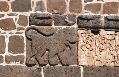 Güney cephesindeki kitâbenin bitiminde, benzerlerine özellikle Artuklu ve Selçuklu yapılarında rastlanan başı cepheden işlenmiş bir arslan kabartması yer alır.