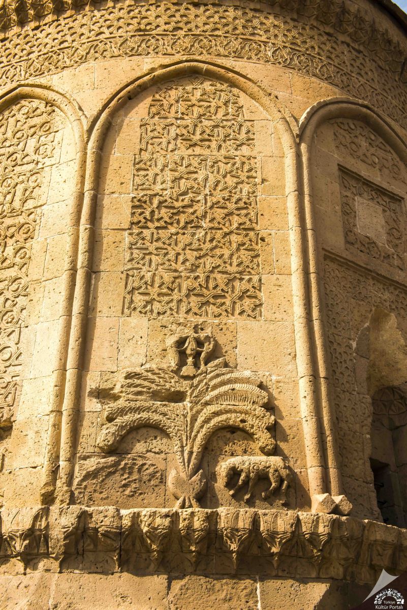 Figürlü plastik süslemelerin bolluğu ile göze çarpan ve abidevi bir çadırı andıran kümbetin kapı cephesi üstünde, insan başlı, kanatlı iki pars figürü arasında çift başlı kartal arması tahrip edilmiş halde belli olmaktadır.